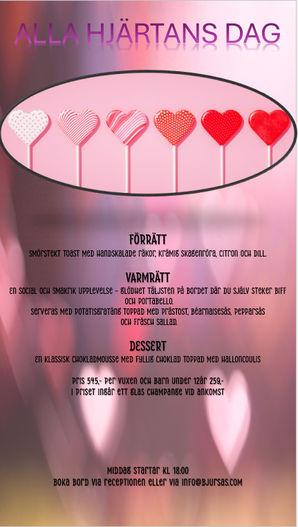 Vi har även kvällsöppet måndag, fredag och lördag kl 17:00–21:00. Vi rekommenderar att boka bord genom att mejla receptionen på info@bjursas.com.